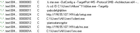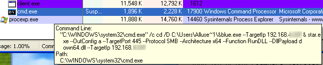 We observed the trojan running blue.exe with its commandline arguments. This is an attempt to spread to other machines on the internal network: