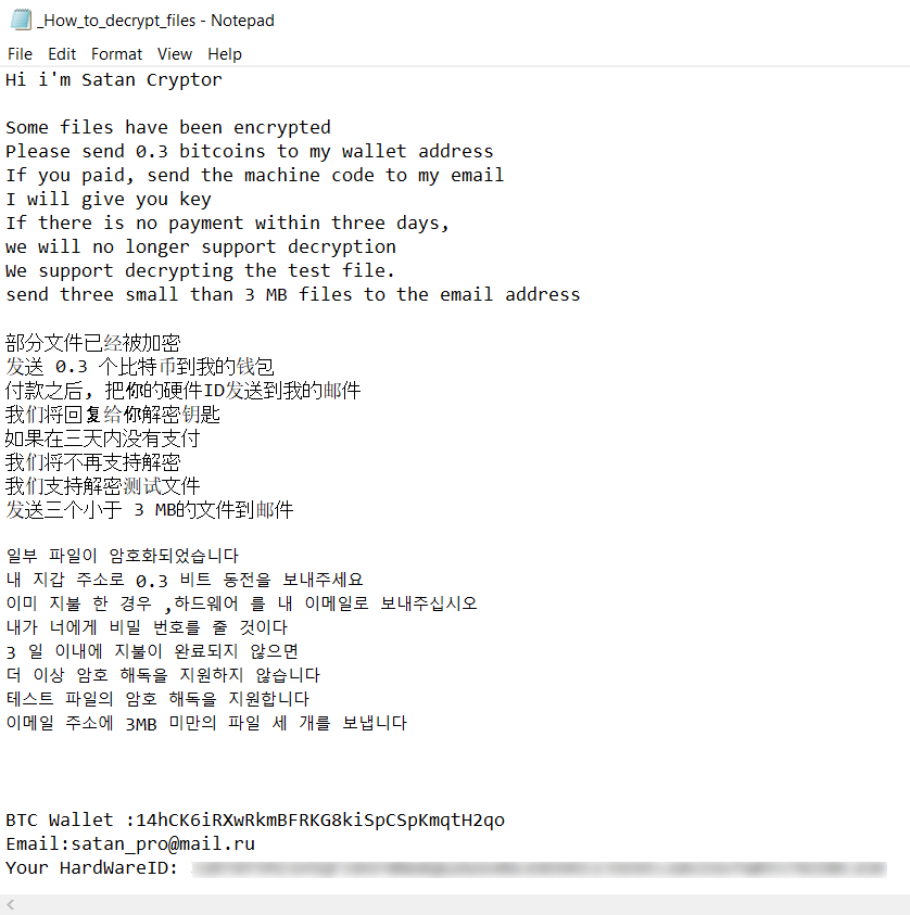 We reached out to satan_pro@mail.ru concerning file decryption but did not receive a response.