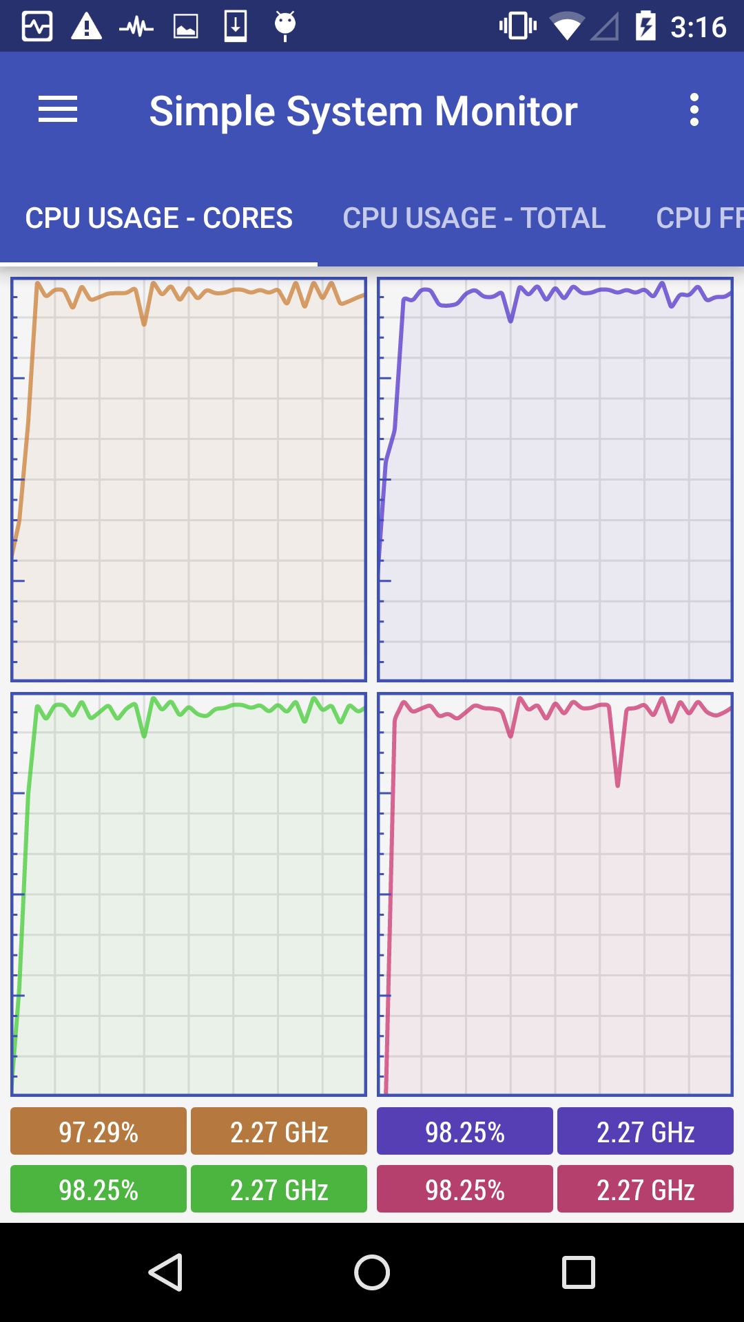 Upon getting the desired privileges the app starts mining Monero coins in the background. No indications of this activity are shown to the victim, meanwhile CPU usage almost reaches 100% utilization: