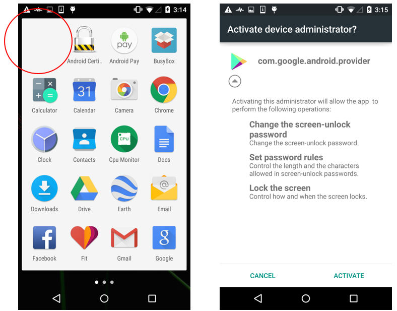 The app does not show an icon in the app drawer upon installation. Once the app starts it requests for device administrator privileges: