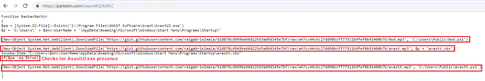 The PowerShell code downloads “C:\Users\Public\Nod.ps1” and “%APPDAT%\Microsoft\Windows\Start Menu\Programs\Startup\avastt.vbs” from GitHub (subsidiary of Microsoft provides hosting for software development). The PowerShell code also downloads "C:\Users\Public\avastt.ps1", if “C:\Program Files\AVAST Software\Avast\AvastUI.exe” is not present on the victim's machine. The PowerShell code executes the avastt.vbs: