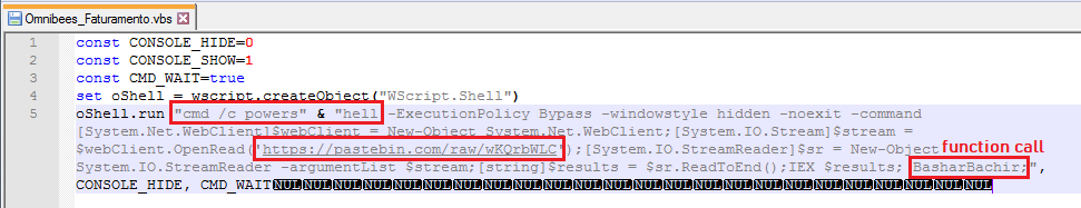 The VBScript loads the PowerShell code from Pastebin (text storage site) and invokes “BasharBachir” function using powershell.exe: