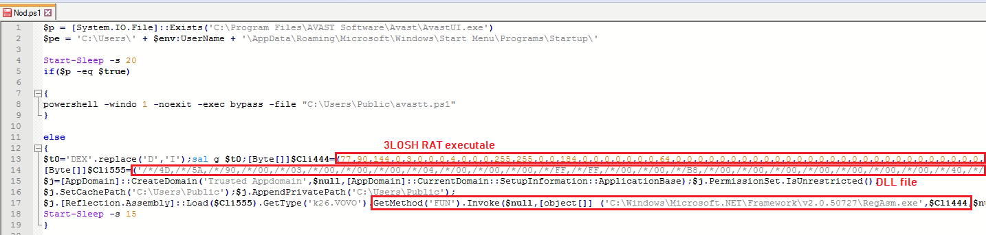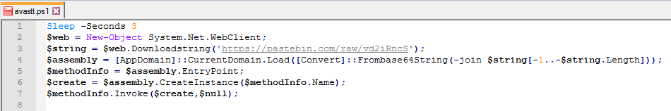 If Avast executable is present on the victim’s machine the PowerShell script executes another PowerShell script from “C:\Users\Public\avastt.ps1”. The avastt.ps1 PowerShell script reads content from Pastebin, reverses the content and performs Base64 decoding to get the 3LOSH RAT executable file. The PowerShell script loads the 3LOSH RAT executable and invokes its EP (Entry Point):