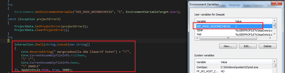 The malware invokes the “install” module which executes "netsh firewall add allowedprogram ENABLE" command in shell and sets environment variable “SEE_MASK_NOZONECHECKS” to “1”: