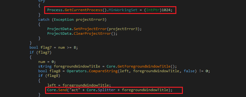 The malware creates a thread which communicates with Command and Control (C&C) server. The main thread executes in a loop which keeps flushing reserved memory of the malware and keeps sending foreground window title to the C&C: