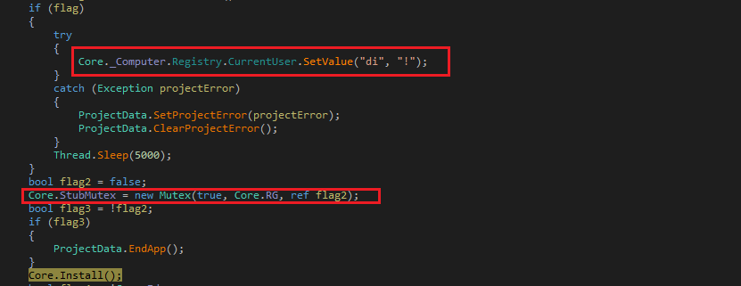 The malware delays execution by 40 seconds using sleep Application Programming Interface (API) then sets registry value "HKEY_CURRENT_USER\di" to “!” . The malware ensures that only one malware process should be running at a time by creating mutex '"165d6ed988ac1dbec1627a1ca9899d84”', if present already it terminates the process immediately:
