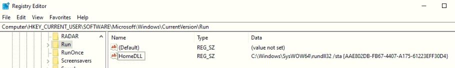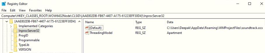 The malware registers the COM DLL “%appdata%\ \WMProjectFiles\soundtrack.ocx” and creates a persistence entry by adding a registry entry into “HKEY_CURRENT_USER\Software\Microsoft\Windows\CurrentVersion\Run” for executing the COM DLL.