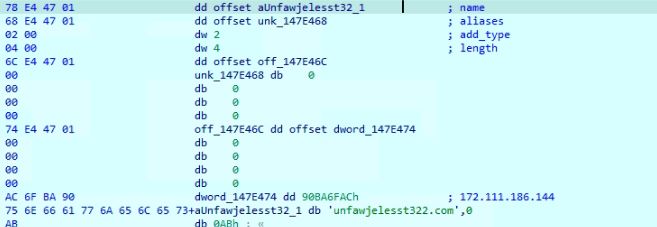 The RC4 encrypted C2 address (AA1EC8EE260AEB1B34081CA091FD29F6240C4F) is decrypted using the RC4 key “noway123!$$#@35@!” to get the C2 address “unfawjelesst322.com.” The malware gets the IP address for the decrypted C2 host using the API gethostbyname and uses socket APIs for communicating with the C2 server.