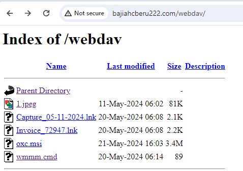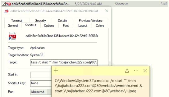 The LNK file, along with the MSI file, is hosted on a WebDAV share by the threat actor.