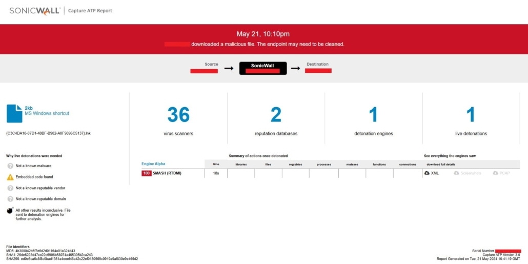 Evidence of detection by the RTDMI(tm) engine can be seen below in the Capture ATP report for this file.