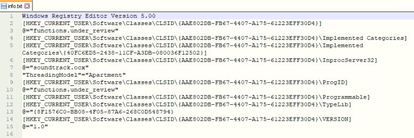 The malware copies extracted files from the directory “%temp%” to “%appdata%\ WMProjectFiles” and imports registry entries from “info.txt” using the Registry Console Tool (reg.exe). The “info.txt” file contains registry entries to register the COM DLL “soundtrack.ocx” with CLSID “AAE802DB-FB67-4407-A175-61223EFF30D4.” The registered COM DLL is executed by “rundll32” with the CLSID in a Single-Threaded Apartment (STA) using the below command line: "rundll32.exe" /sta {AAE802DB-FB67-4407-A175-61223EFF30D4}