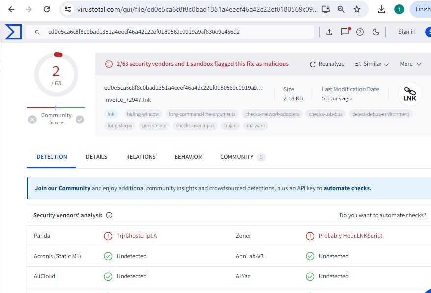 Only a few security providers are detecting the LNK file at the time of analysis in popular threat intelligence sharing portals like VirusTotal and ReversingLabs, indicating its uniqueness and evasiveness: