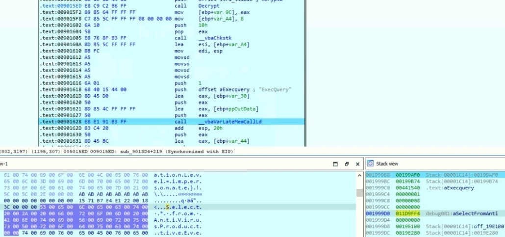 The malware gets the installed antivirus information using Windows Management Instrumentation (WMI) queries. All the strings related to WMI queries are kept encrypted and are decrypted by adding 0x0A to each byte of the encrypted string.