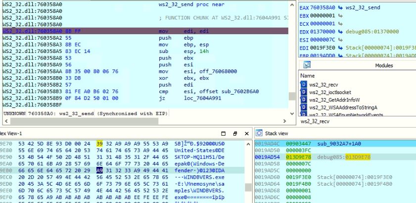 The malware collects and sends system information to the C2 server using the send API from DLL ws2_32.dll. The stolen information is separated using the delimiter “0xA9.”