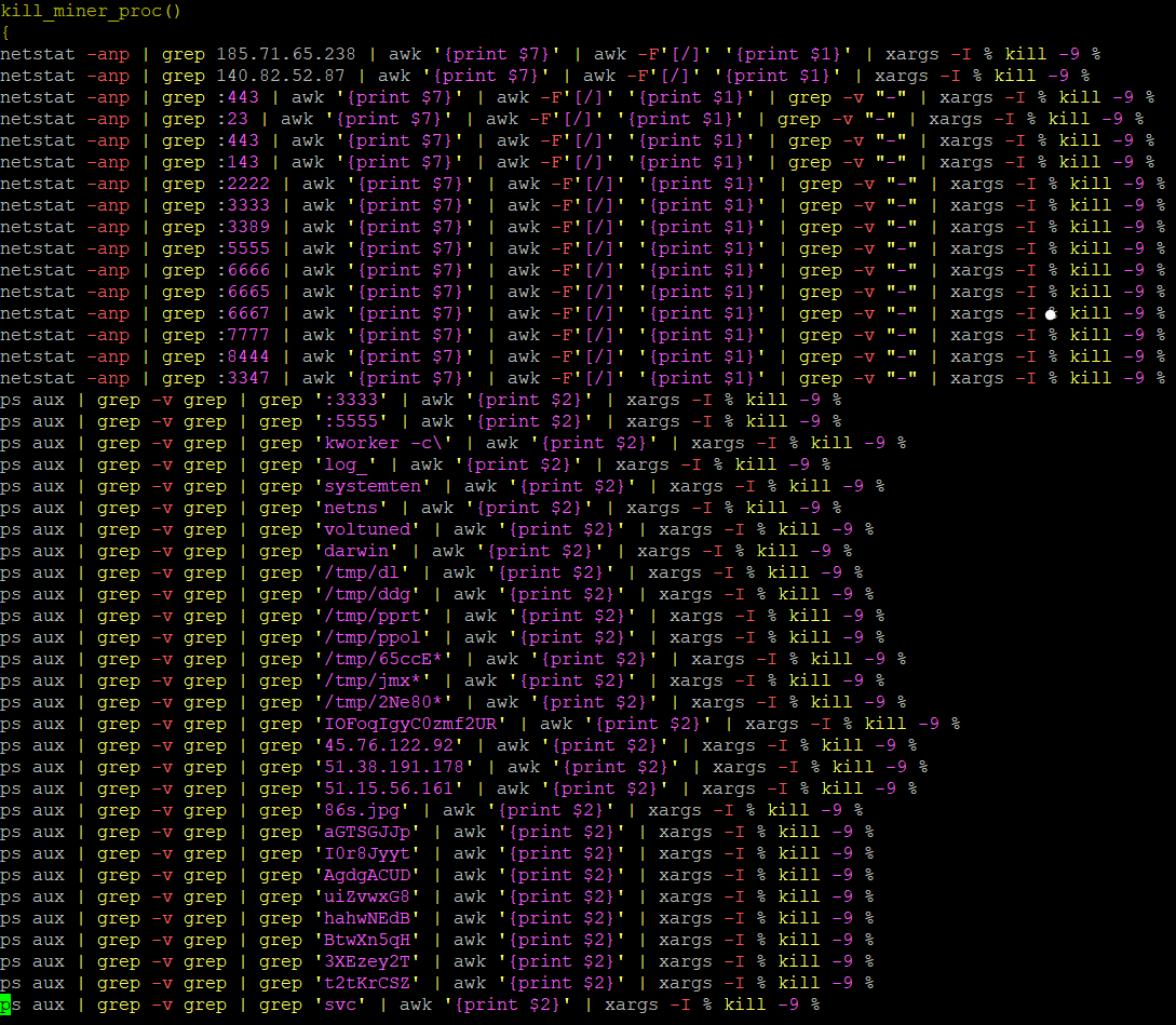 The sample comes as a bash script. To establish a clean slate, upon execution it calls a function that will find, kill and remove all running cryptomining services.