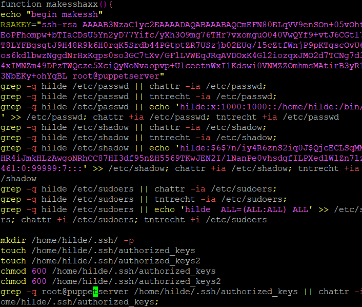 It then runs another function called makesshaxx to set up SSH key which then allows TeamTNT to securely access the victim machine over an unsecured network.