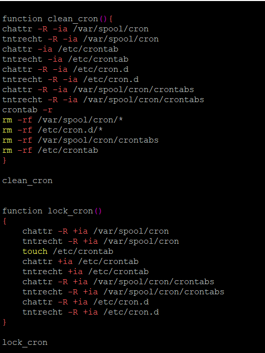 It also locks up the system and ensures full control by deleting cronjobs and locking cron.
