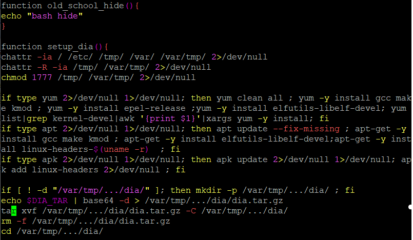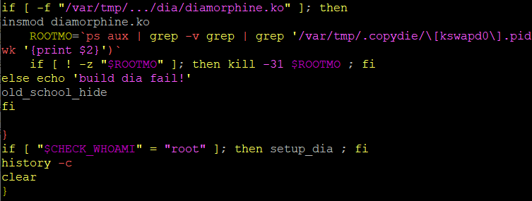 It then deploys an open source rootkit called Diamorphine which it uses to hide itself.