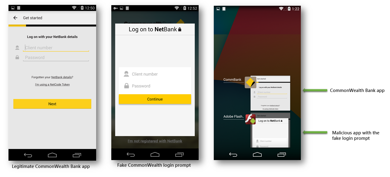 Once the victim opens a targeted app (Commonwealth Bank app in this case) the malicious apk shows its own spoofed login screen: