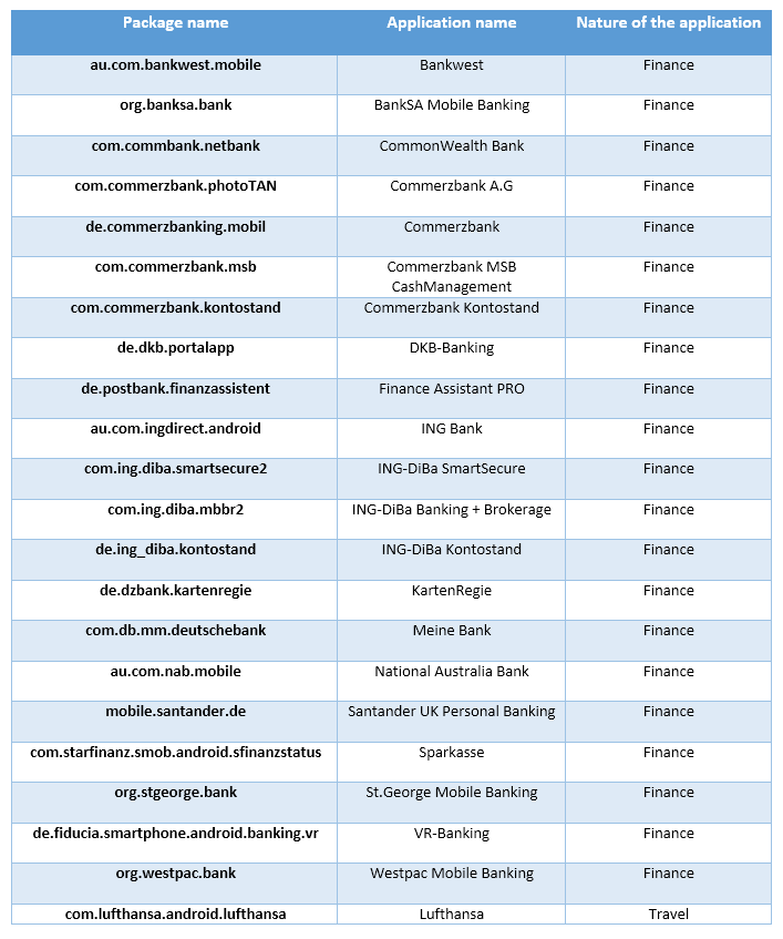 We observed every apk in this campaign to target certain apps that involve credit card expenditures, majority of these were mobile Banking applications. Similar to using Google Play as a medium, the malicious apk monitors the activity of certain hardcoded apps: