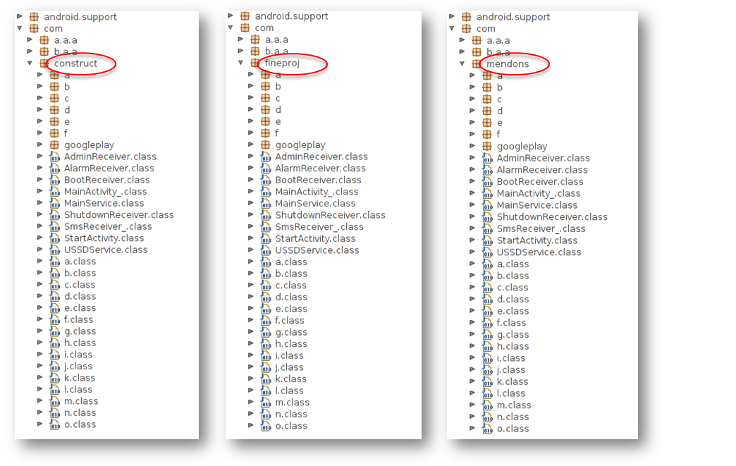 • Apart from the package names,hardcoded server addresses and target apps, there is very little change in the code structure