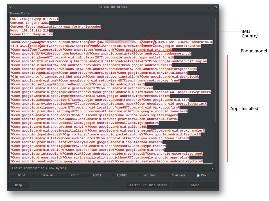 Then each malware starts capturing device related information and transmits this to its respective hardcoded server present in the code. The following information is sent as a POST request: