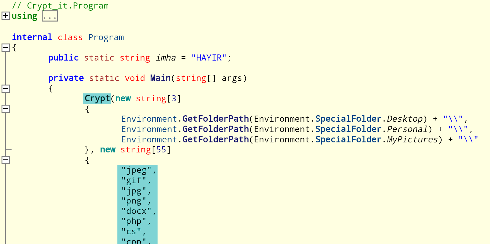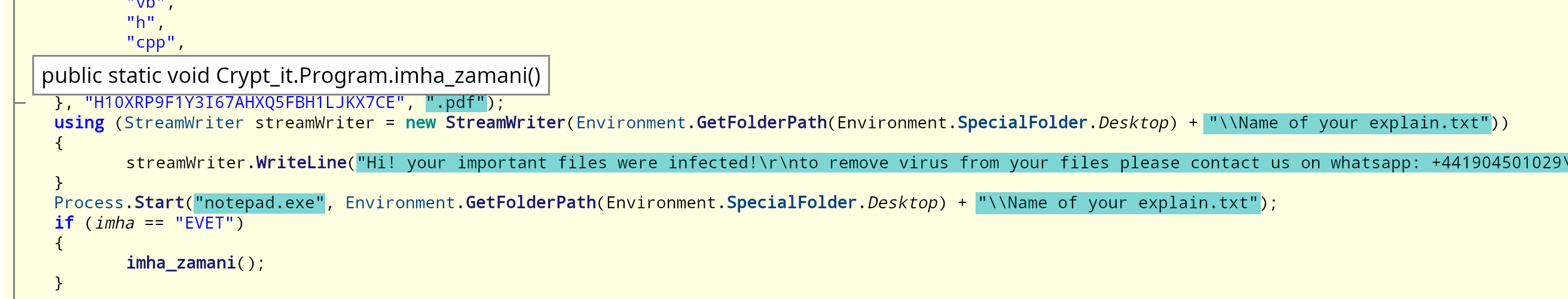 The malware is written in .NET and is easy to decompile. Although no modification of files took place during our analysis, the code evidently contains functionality to encrypt files. It is coded to give encrypted files a .pdf extension: