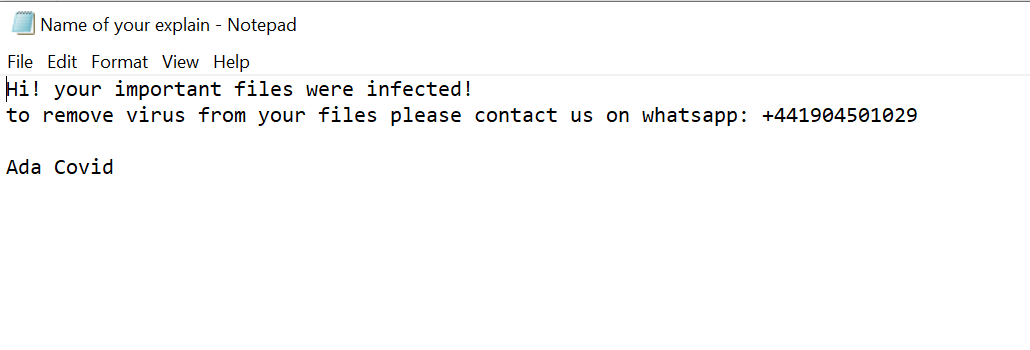The SonicWall Capture Labs threat research team have come across a new ransomware family known as Ada Covid. The sample we analysed appears to be in early stages of development and does not modify any files on the system. It does, however, contain the ability to do so. An interesting shift with this malware is that the operators have chosen WhatsApp as a means of communication with infected users. This could be in response to the social change triggered by the current global pandemic. The operators perhaps, realize that instant messaging is a more effective negotiation medium when victims are stuck at home abiding by shelter-in-place orders. This is opposed to messaging via email, the medium of choice for many ransomware operators in the past.
