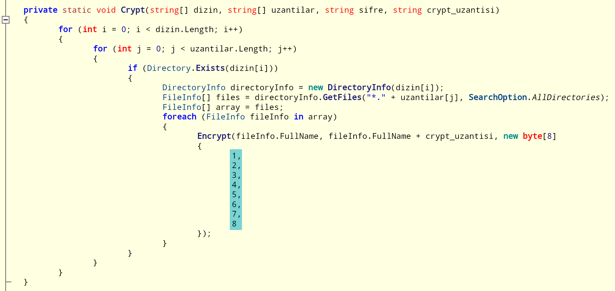 If files were actually encrypted, the encryption key (1,2,3,4,5,6,7,8) is easy to obtain: