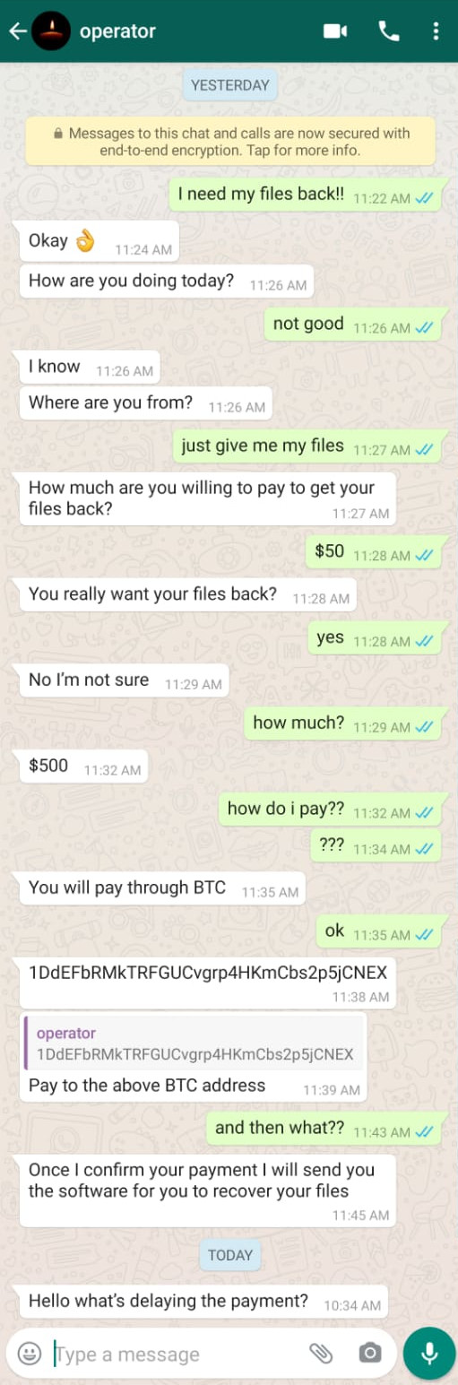 As stated in the ransom message, WhatsApp is the medium of choice for negotiation. We had the following conversation with the operator via WhatsApp: