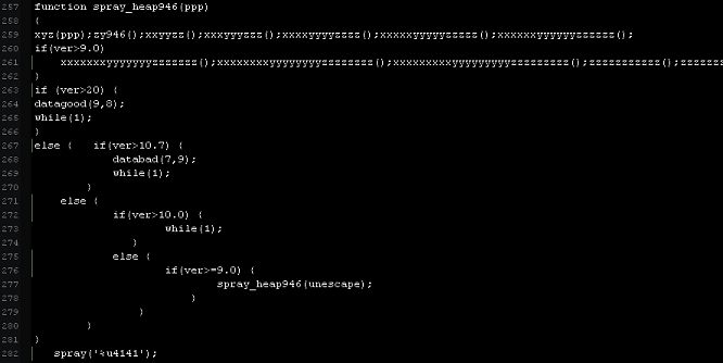 A code snippet from decoded version of JavaScript that performs heap spray and drops a malicious executable file onto the target machine can be seen below: