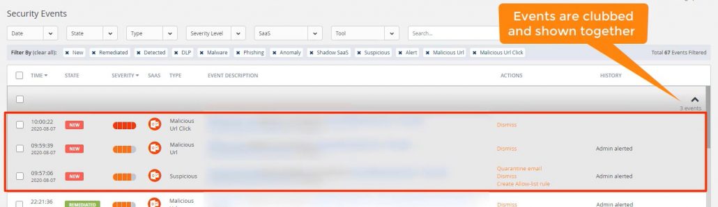Encountering a threat and obtaining forensic details of that threat are two separate actions that SonicWall’s Cloud App Security seamlessly stitches together without losing the essence or any details in translation. Each stage of the Click-Time Protection process is recorded for investigation and auditing purposes, from the original URL substitution event to the result of the time-of-click scan. Each step is logged and can be readily accessed based on the threat type. The events are grouped together so the activity can be easily understood.