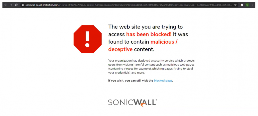 Once Click-Time Protection has been enabled and policies are set, all links contained in incoming emails are replaced with SonicWall links. When the user clicks on a link, it triggers an immediate scan of the target site. If it is determined to be benign, the user continues without interruption. If it is determined to be malicious, the user is sent to a warning page. The user may be provided a link to the malicious page based on the policy and group he has been assigned to by the admin.