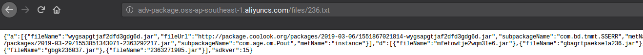 Once we started the application, it contacted a URL for a text file - adv-package.oss-ap-southeast-1.aliyuncs.com/files/236.txt