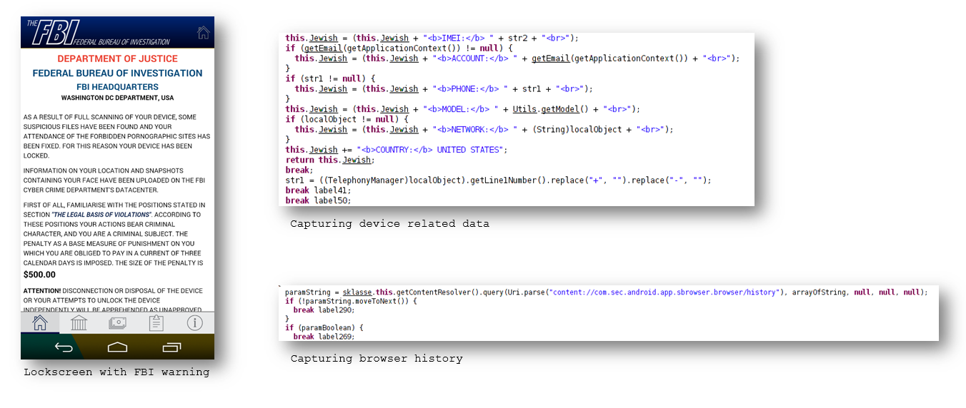 The malware then shows a lockscreen with FBI (Federal Bureau of Investigation) warning message thereby disabling general usability of the mobile device as all the control buttons are superceded by this lockscreen. In the background the malware starts to gather a suite of information from the device which is later used on the lockscreen making the lockscreen more "personal" for the user. The following are a few key pieces of data that are gathered: