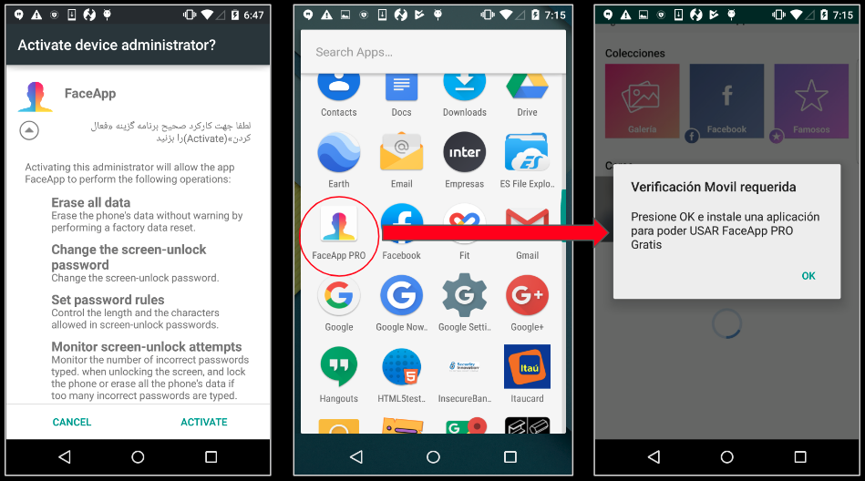This application has already been highlighted previously when discussing the verification scam. Among other application names we saw the name FaceApp being used as part of this scam (Koodous link):