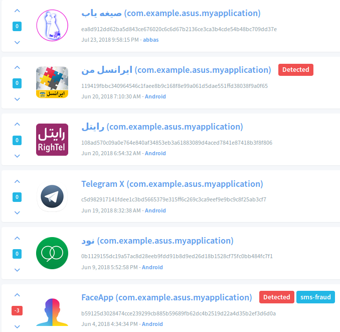 As visible below there are a number of apps with the same name but different icons, FaceApp being one of them (Koodous link)