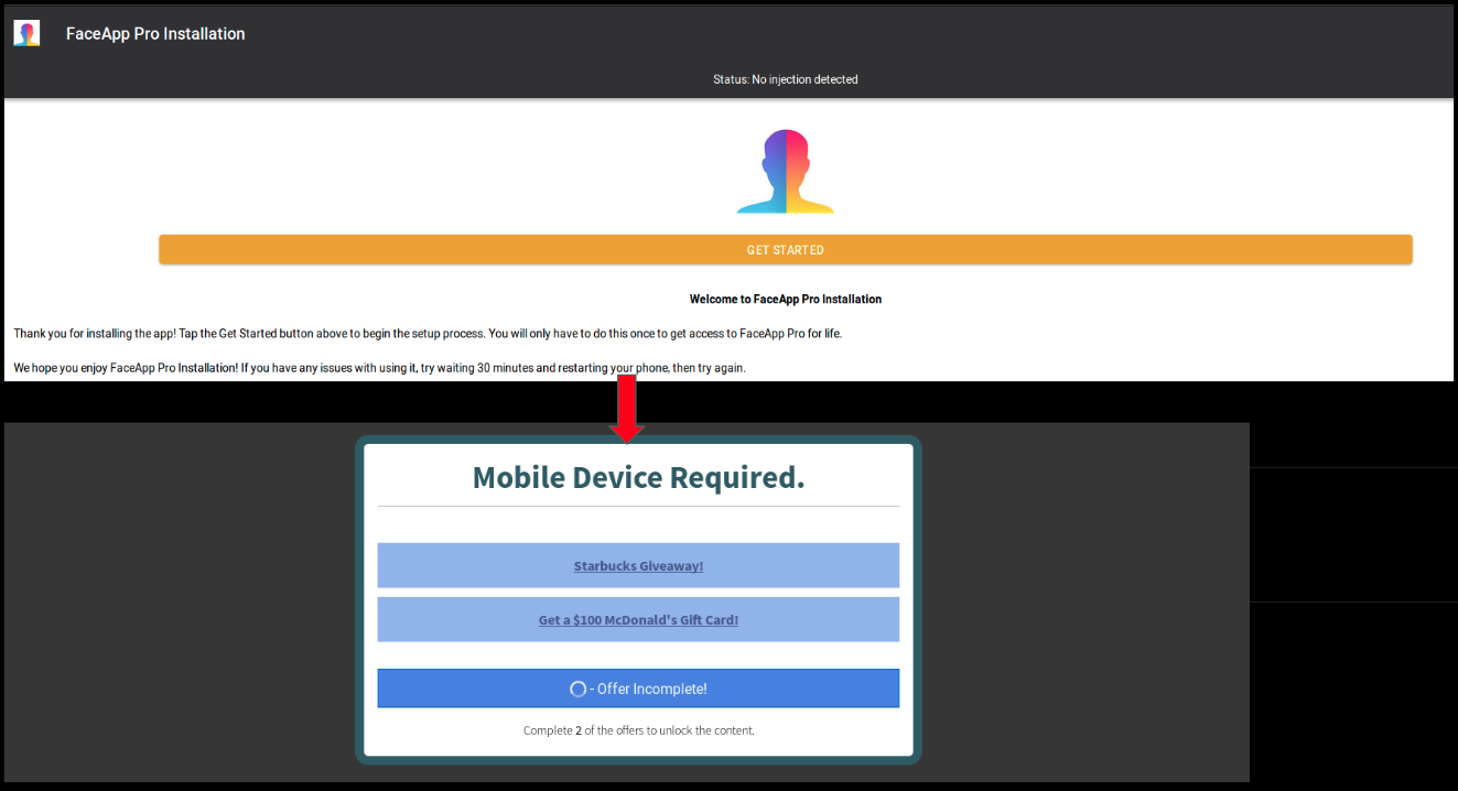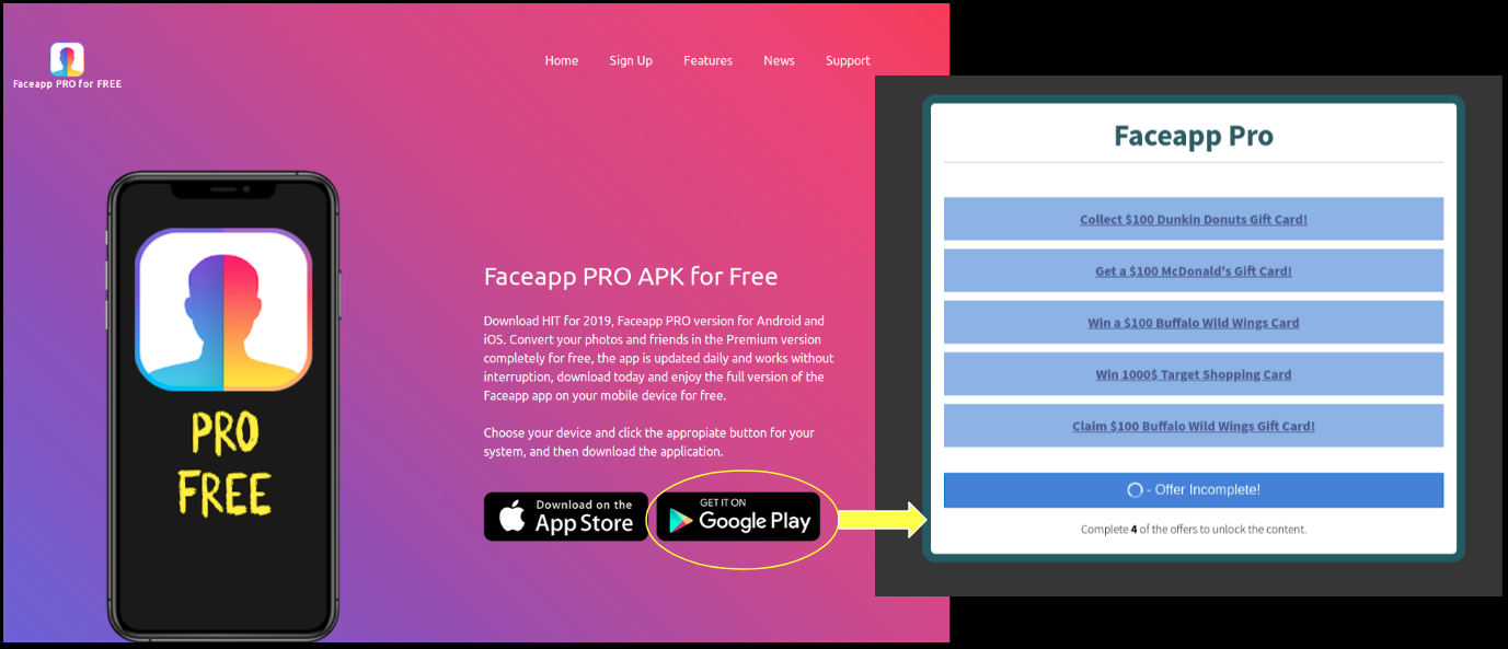 There are a number of websites which claim to provide FaceApp Pro version for free. Upon clicking them, the user is redirected to a fake survey/verification websites aiming to extract sensitive user information such as email and credit card details. Here are some examples of such websites (at the time of writing this blog):