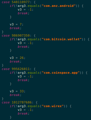 One of the commands checkApps checks for presence of apps among a long list of financial applications that the malware keeps track of. This list includes a mix of banking and crypto related apps, this is something new as malware traditionally targeted banking apps. The recent rise in popularity and currency of crypto may have led to this new inclusion: