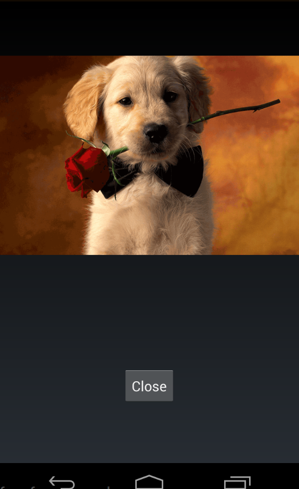 Once executed it shows the image of a puppy with a button named Close: