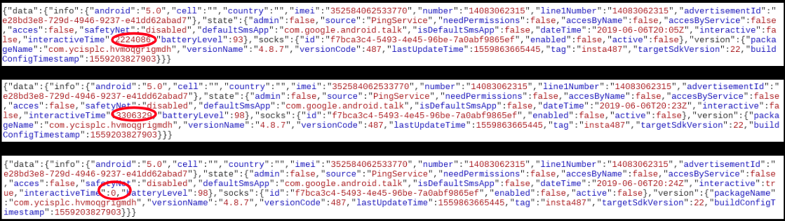 An interesting thing we observed was anytime we did not perform an activity on the device, the malware would calculate and keep track of the idle time and relay it to the C2C server, below image shows how the time gets reset to 0 once we performed an activity on the device (which includes any sort of user intervention):