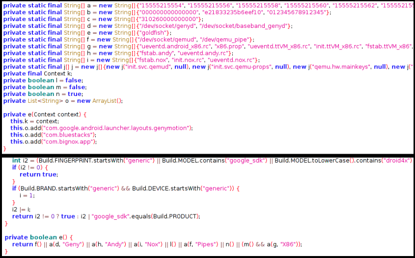 This sample has multiple levels of checks to ensure that its not running in a virtual/sandboxed environment, it checks for presence of specific files related to Qemu, Genymotion, Bluestacks and Bignox: