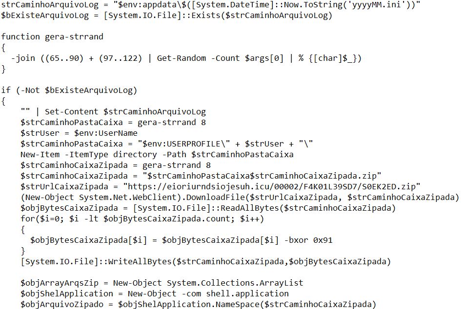 Deobfuscated batch script as shown below, downloads initial payload from 'http://fortalecergroup.com.br/bals/index.php?o=YmFsczM='