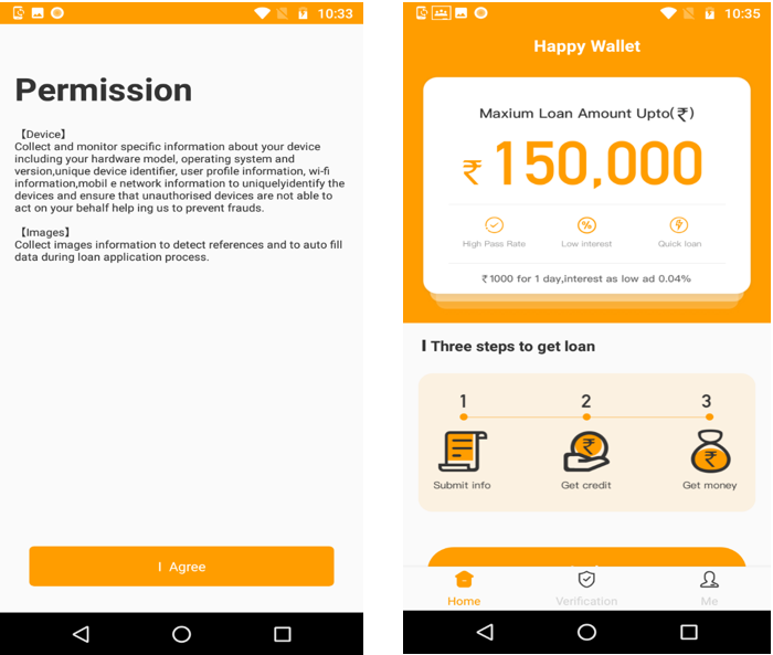 Post installation, it showed a list of permissions required. Interestingly, the app prompted the user to grant permissions by describing why those permissions are required. The app instructed the user to complete 3 steps to get a loan.