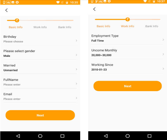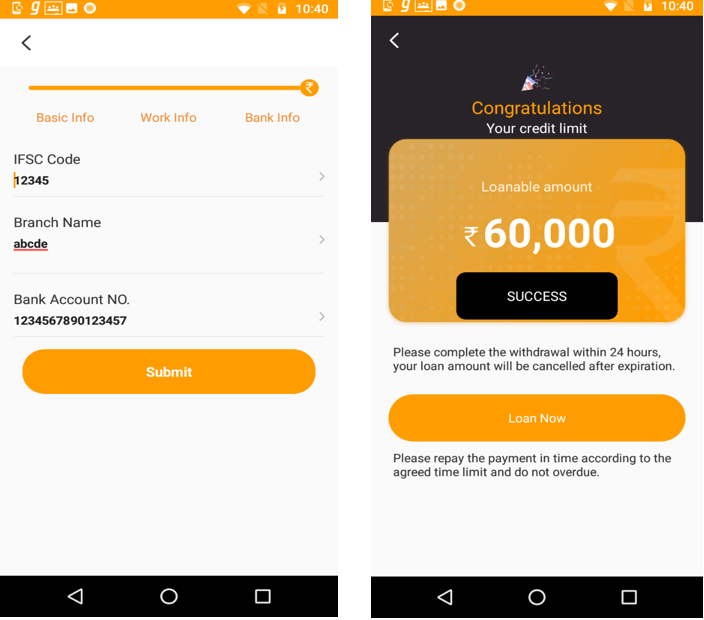 In the first step, called the “Submit info”, personal, work and bank related information are collected from the user. There is no validation for entered user account details which are being asked as shown below: