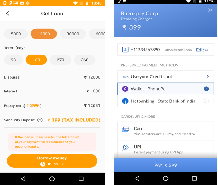 In the second step, the user’s credit limit is computed as is assumed based on the information provided in step one. The user is then asked to make a payment of 399INR as a security deposit before the loan request could be processed further. Various payment options like Net banking, UPI, and Debit/Credit Card are provided to the user. An active timer is also started to rush in the user into making payment.