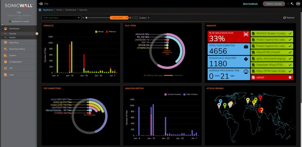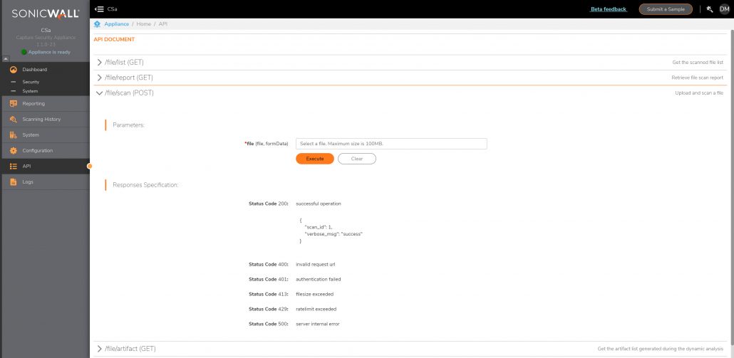 Non-SonicWall customers can use the CSa 1000 API capabilities to tap into the power of RTDMI for their internal workflows. A website portal for file submissions in an insurance company can ensure that malicious PDF and Office documents do not land on its network. Threat analysts inside of large organizations can script against the CSa 1000 API to rapidly assess whether a suspicious file that they gathered as part of evidence collection is malicious or benign.