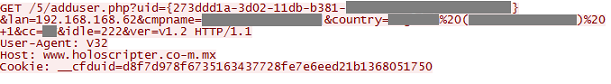 The Malware communicates with the server at www.holoscripter.co-m.mx. One of the parameters used during the communication is 'adduser' followed by information about the victim machine. This appears to be registering the computer on the server as a victim.